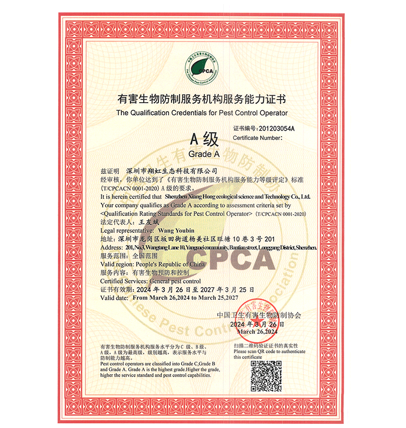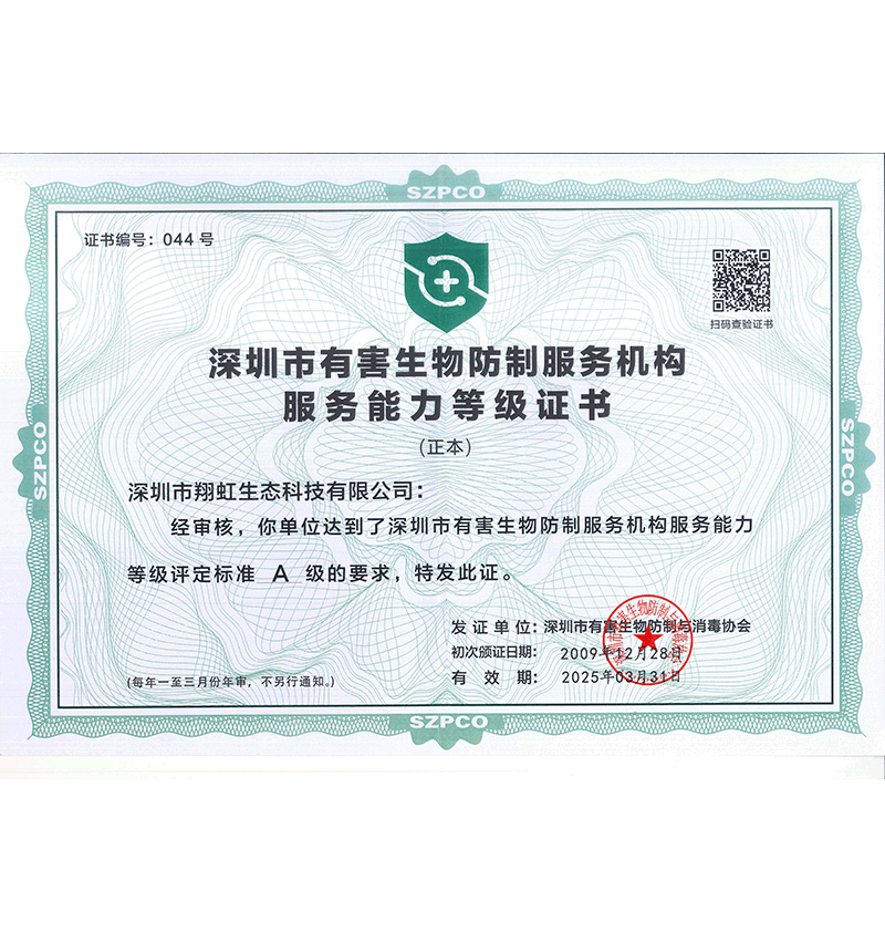 深圳市翔虹生態(tài)科技有限公司成立于1995年,是深圳最早成立的專業(yè)蟲(chóng)害防治公司之一。公司發(fā)展至今獲得全國(guó)有害生物防制服務(wù)A級(jí)資質(zhì)、廣東省有害生物防制服務(wù)A級(jí)資質(zhì)、深圳市有害生物防制服務(wù)A級(jí)資質(zhì)、廣東省有害生物防制服務(wù)A級(jí)資質(zhì)、深圳市有害生物防制服務(wù)甲級(jí)資質(zhì)的單位,是中國(guó)有害生物防治協(xié)會(huì)會(huì)員、廣東省有害生物防治協(xié)會(huì)會(huì)員、深圳市有害生物防治協(xié)會(huì)理事單位,多次獲得“深圳市十佳消殺單位”榮譽(yù)。